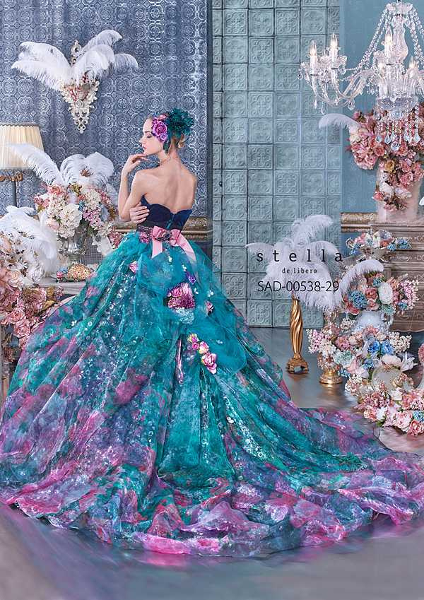 ベースにはモネの睡蓮調の色彩、スパンコールの煌めきと相まったかすかな色の写りが素敵に映え、冬のシーンに合うようなニュアンスカラーを意識したデザイン。 アンティークな趣と3種類のゴージャスなブローチが重厚な豪華さを感じさせる1着。