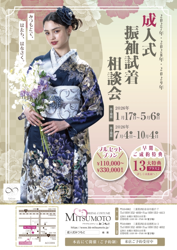 2026年1月17日(土)から、2027・2028・2029年に成人式を迎える方を対象にした、振袖の試着相談会を開催致します!