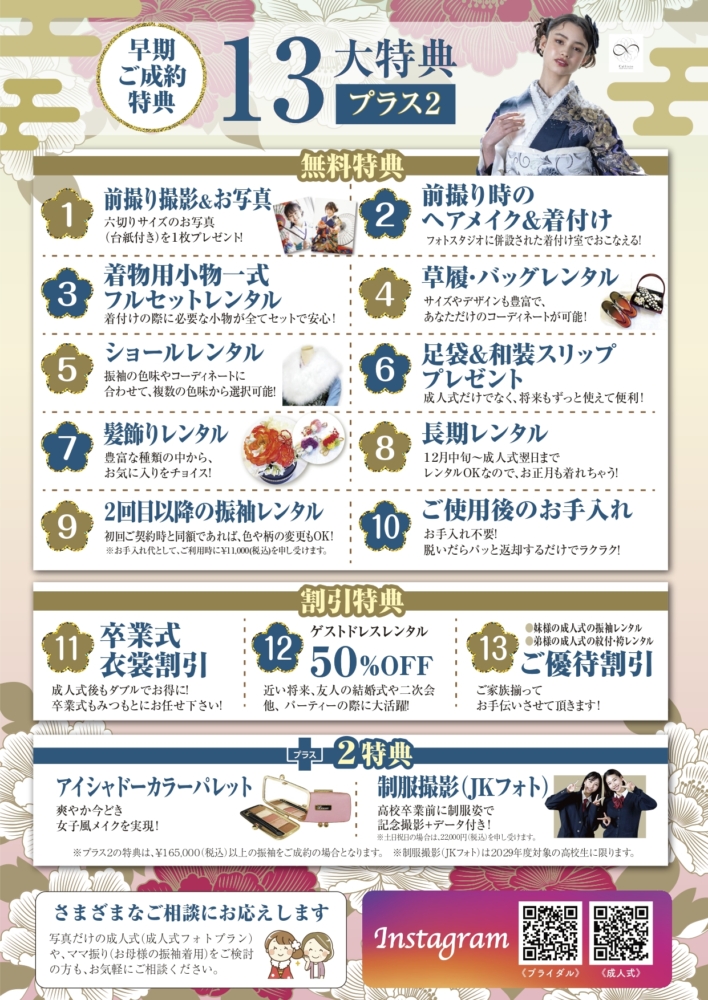 さらに、¥165000以上(税込)の商品をご成約の方には、13大特典に加えてプラスツーとして、アイシャドーカラーパレットと制服撮影(JKフォト)をプレゼント!