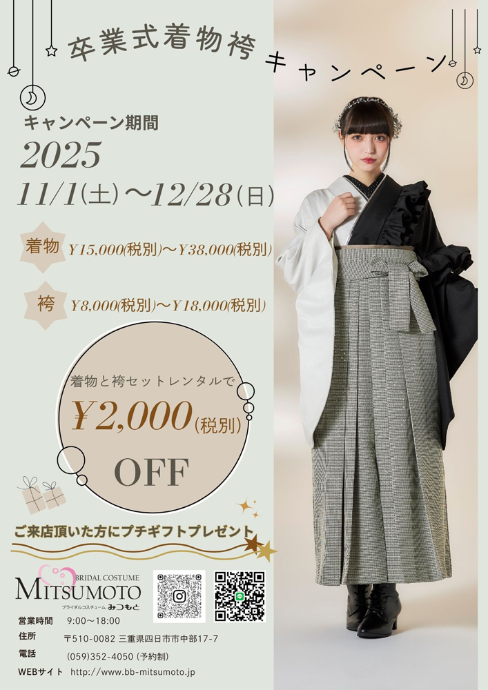 卒業式の着物と袴をセットで、早期ご契約いただくと¥2,000(税抜)お得に!